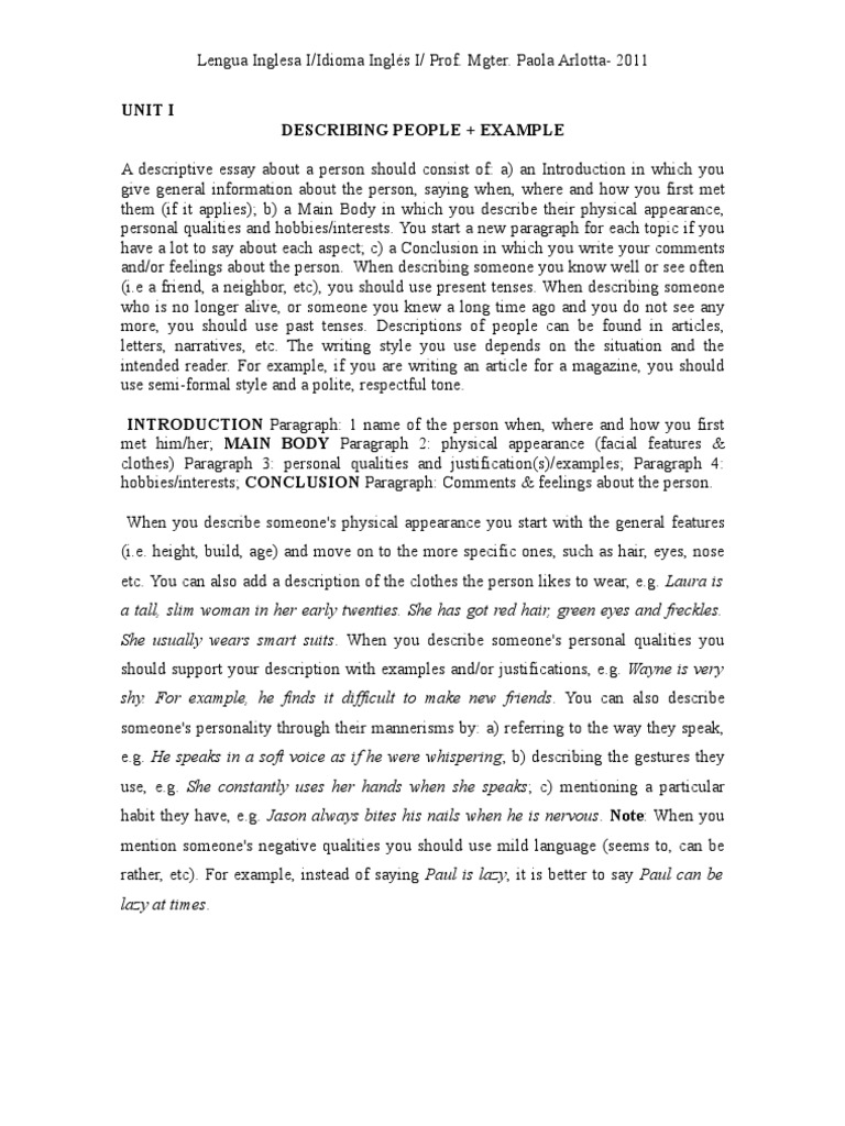 Special offer! Promo code: SAVE A descriptive essay reveals the meaning of a subject through detailed, sensory observation. Sensory details are details of smell, taste, texture, sound, and sight. Instead, I have my grandmother, a woman solidly built in both describing a person essay and character. Her inspirational work and personality have influenced my decisions from birth to death date, describing a person essay.